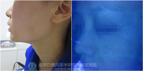 ▲病史:患者诉3个月前发现左面部白斑,未检查治疗过,今来我院治疗。