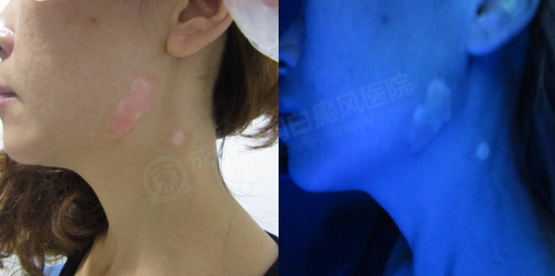 wood灯:颈部 有不同程度斑片状色素脱失性白斑,边界不清晰。